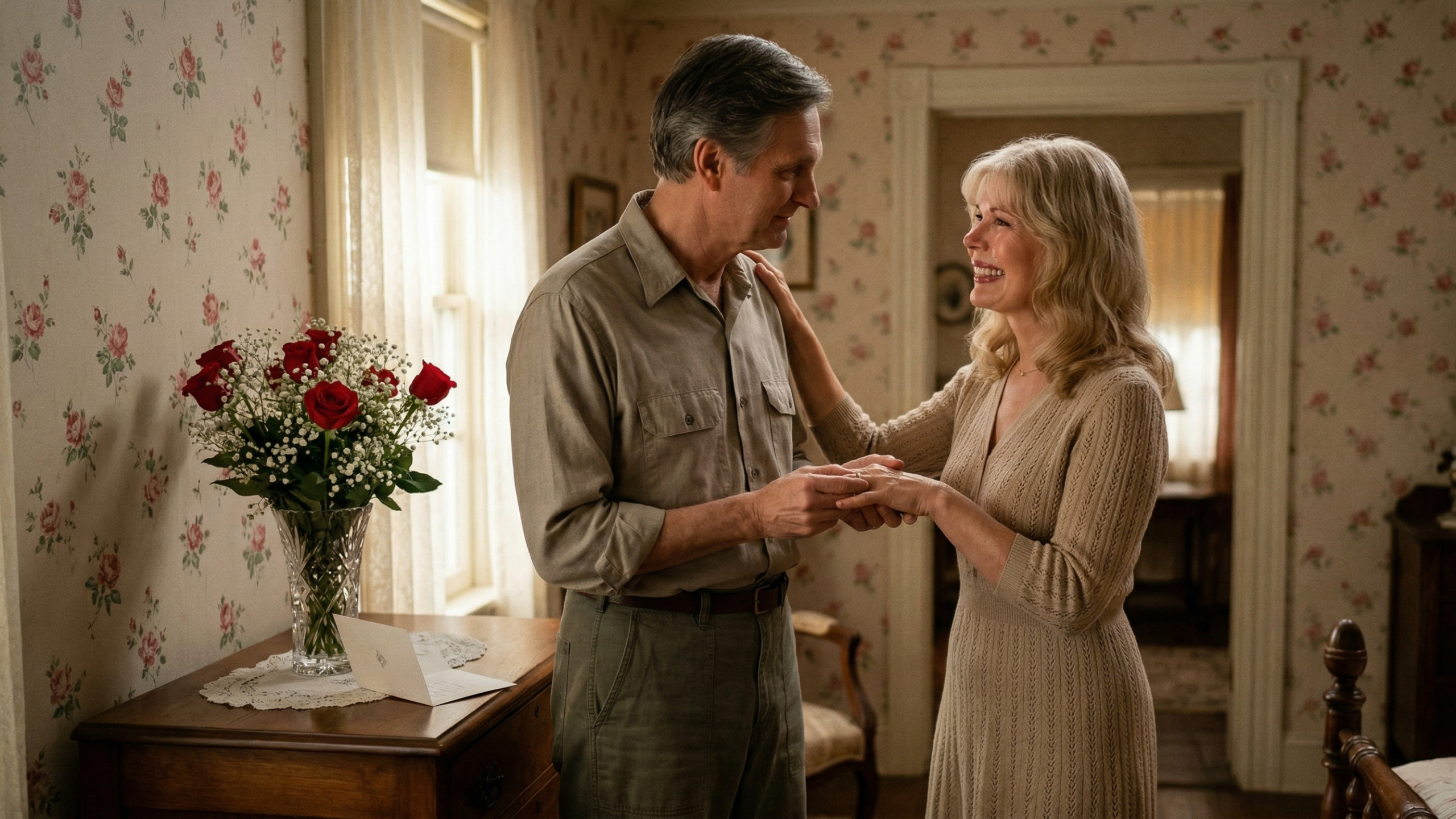 “Your mother had good taste,” Margaret told him, her eyes still examining the room. They stopped when they landed on a bouquet of red roses and baby’s breath sitting in a crystal vase on the dresser. Stepping towards them she buried her face in the blossoms, inhaling their scent deeply. When she pulled away, she felt a bit dizzy.