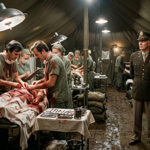 “Frank, if you don’t get me that blood in five seconds, I’m going to perform an emergency proctology exam on you using this clipboard!” Hawkeye roared, the veins…
